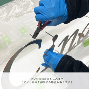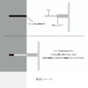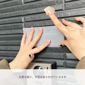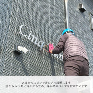 字型に合わせて壁面に穴をあけ、プレートの取り付けを行います。