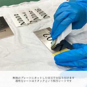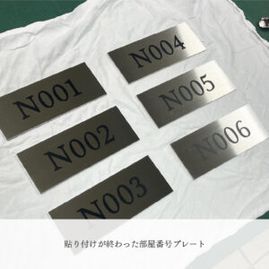 部屋番号プレートは、ステンレス製のプレートに、黒の切文字シートを後から貼り付けます。
